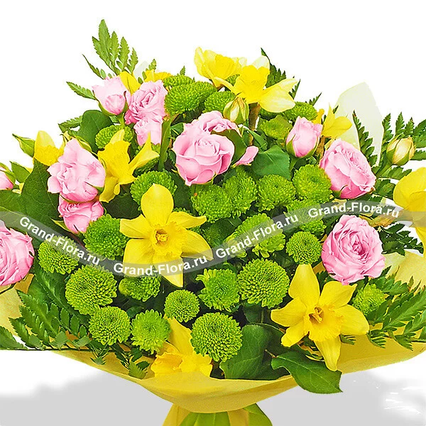 ЛЮКС: роза кустовая розовая - 4 шт, хризантема кустовая зеленая (сантини) - 3 шт, нарциссы - 5 шт, декоративная зелень, фетр желтый.