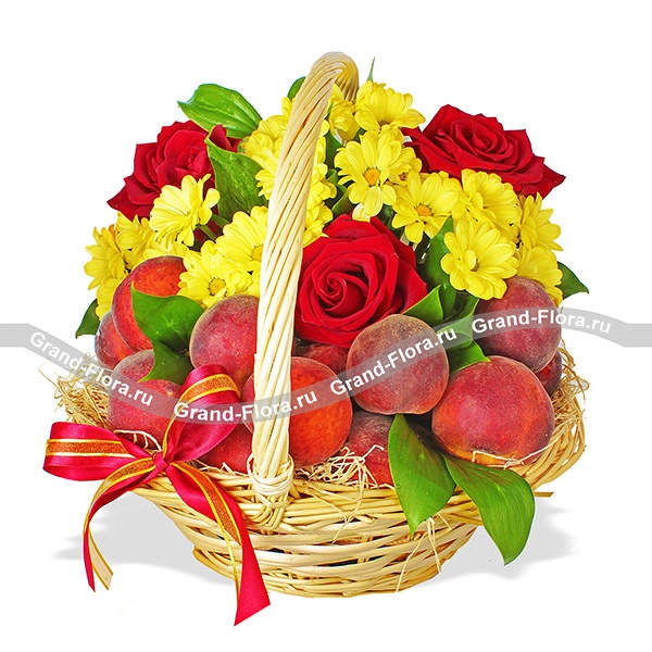 Уменьшенный: роза красная - 1 шт., хризантема желтая кустовая - 2 шт., рускус - 1 шт., оазис, корзина малая, бант красный, персики - 1 кг.