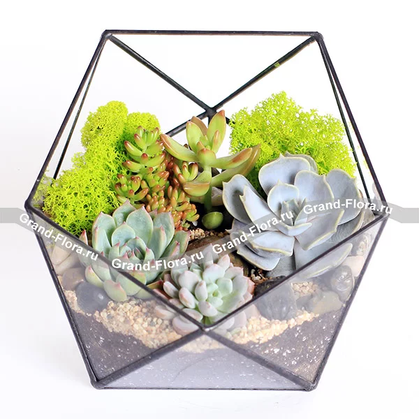 Флорариум "Краски лета" - это прекрасное сочетание несколько видов ярких суккулентов в геометрической вазе ручной работы. Такая композиция не оставит равнодушными ваших родных и близких, а цветение суккулентов весной вызовет восторг и восхищение.