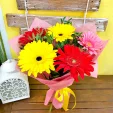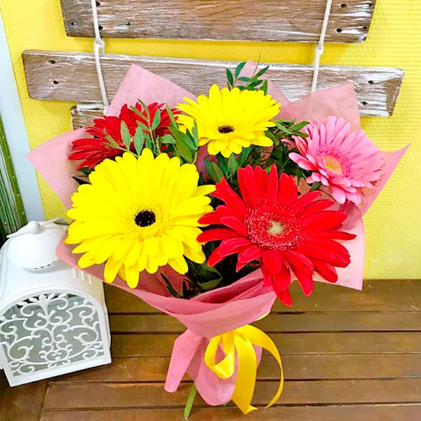 поможет солнечное сочетание пестрых гербер. Нежно розовый цвет намекнет о симпатии,  желтый о дружеском интересе, оранжево-красный станет комплиментом, а насыщенно-розовый